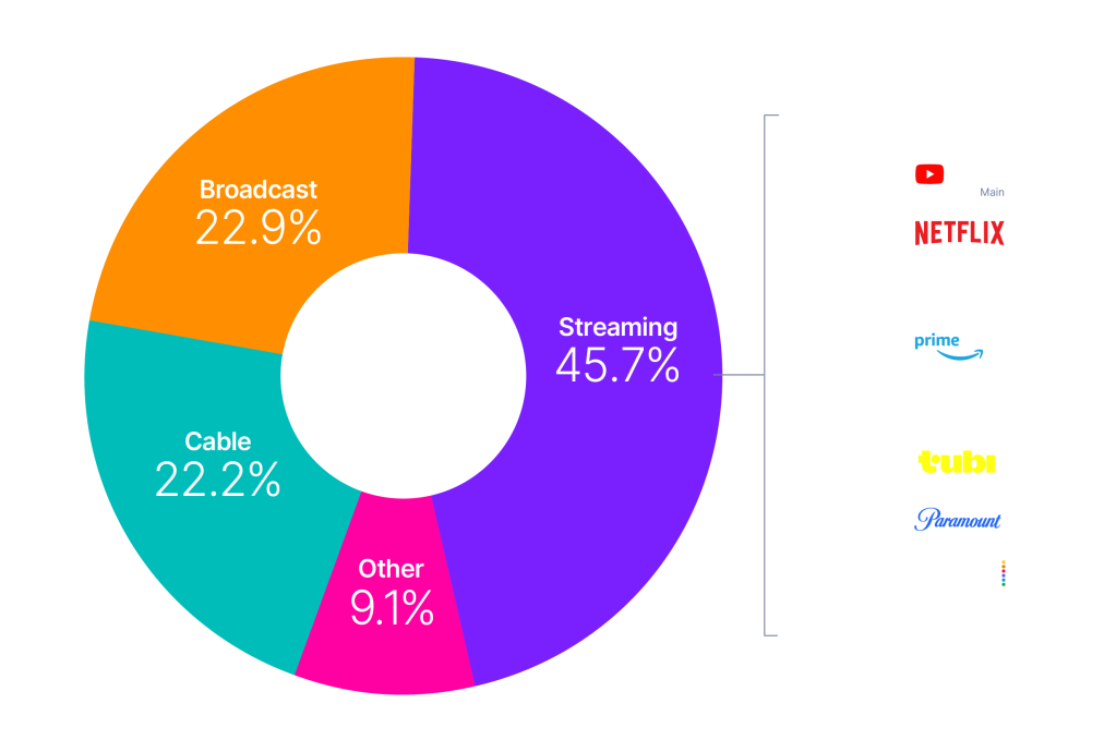 Linear streaming (as defined by the aggregation of viewing to vMVPD/MVPD apps) is excluded from the streaming category as the broadcast and cable content viewed through these apps credits to its respective category. This methodological change was implemented with the February 2023 interval.