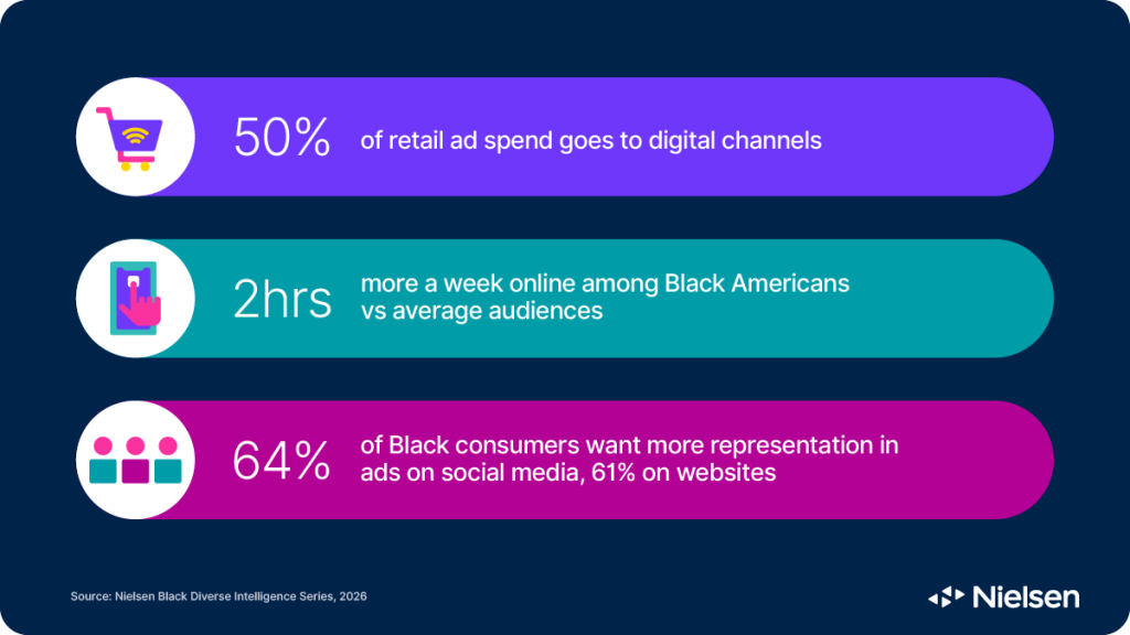 In the retail category alone, Nielsen Ad Intel data shows half of ad spend goes to digital channels. Black consumers are a key audience online, averaging two hours more a week with digital media than the total audiences.4 However, the ads Black consumers encounter don’t always connect. 64% of Black audiences agree they want more representation in ads on social media and 61% on websites.5