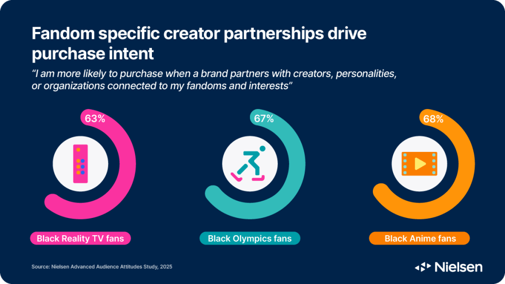 The inclusive creator approach is not just driving content engagement. Black consumers are also more likely to take action. 52% of Black audiences agreed they’re more likely to purchase when a brand partners with creators, personalities, or organizations connected to their fandoms and interests compared to 45% overall.9 That number climbs even higher when you look at different Black identities within the community.