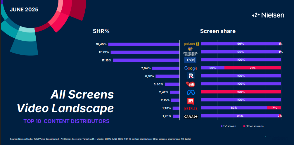 Warsaw, Poland, 21.07.25: Nielsen, the global leader in audience measurement, data and analytics, has released its latest June All Screens Video Landscape report, covering viewing (a combination of total reach and time spent) from four screens: TVs, PC/laptops, smartphones and tablets.